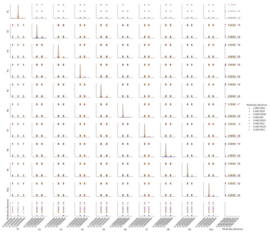 Upon final training, the model achieved a mean absolute error (MAE) of 0.0530, and a Mean-Squared Error (MSE) of 0.0294. The model’s predictions closely matched the actual values reflecting high accuracy in revenue forecasting. The validation loss of the best model () is printed as the final result. Figure 5 is the pairplot graph between the ingredients and revenue, which is a reliable way of visualizing the effect of all the ingredients individually on revenue. The graph would be more informative with a greater correlation between the features and target, which would be the case with real data.