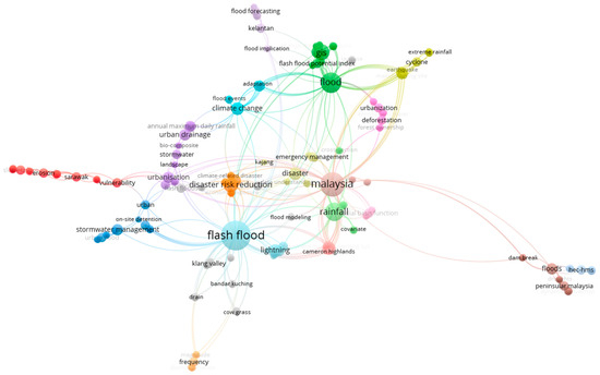 Hydrological disasters encompass extreme situations, actions, and water distributions, including floods and droughts. Hydrological disasters typically result from a confluence of physical processes that interact and compound over various spatial and temporal scales. A natural calamity that occurs constantly worldwide is flooding [11]. Flooding can be interpreted as the coverage and condition of water that inundates an area normally in a dry state [12]. Floods can occur in flat and low-lying areas when the water level of rivers or seas is high, continuous heavy rains occur, the ice at the Arctic Pole melts, and monsoon winds occur every year [12]. When there is a flood, the soil becomes saturated with water, preventing water infiltration. Flash flood-related information is established based on the Scopus datasets. In Malaysia, disaster risk reduction, mainly in flood-related issues, is more essential. To determine the most relevant concerns and Malaysian context for research connected to flash floods, relevant literature is gathered using the Scopus databases, and applicable author keywords are produced within those works (Figure 1).