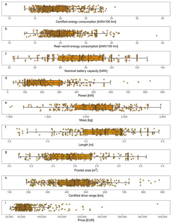 Boxplots of vehicle attributes; dots represent individual vehicle models; vertical lines depict the median, upper and lower quartiles, and 1.5 times the interquartile range of the data; certified energy consumption is based on TEL and TEH values; real-world energy consumption is based on mid-point values of data obtained from EVD [7] and mean values obtained from Spritmonitor [28]; the y-axis is used to disperse the data and is unitless; letters (a–i) within the plot areas are used to identify plots for individual vehicle attributes in the main text.