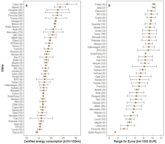 Mean and standard deviation of certified energy consumption (a) and drive range per Euro vehicle price (b) by vehicle manufacturer; numbers in parentheses indicate the sample size; we exclude manufacturers for which no data are available; certified energy consumption is based on TEL and TEH values.