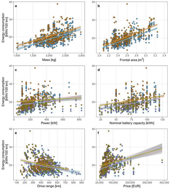 Certified energy consumption (light blue) and real-world energy consumption (yellow) as a function of vehicle mass, frontal area, power, nominal battery capacity, drive range, and price; shaded areas represent the 95% confidence interval of the regression line; certified energy consumption is based on TEL and TEH values; real-world energy consumption is based on mid-point values of data obtained from EVD [7] and mean values obtained from Spritmonitor [28]; letters (a–f) within the plot areas are used to identify plots for individual vehicle attributes in the main text.