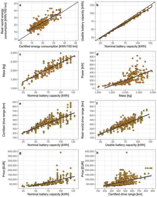 Complementary regression analyses; thin black lines in (a,b) depict a slope of one and a y-axis intercept of zero; thick black lines depict regression lines; shaded areas represent the 95% confidence interval of the regression line; certified energy consumption is based on TEL and TEH values; real-world energy consumption is based on mid-point values of data obtained from EVD [7] and mean values obtained from Spritmonitor [28]; letters (a–h) within the plot areas are used to identify plots for individual vehicle attributes in the main text.