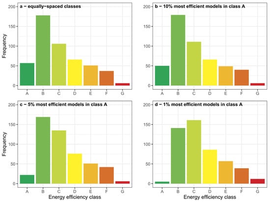 Distribution of vehicle models across efficiency classes A to G, based on certified TEL and TEH energy consumption values; panel (a) displays classes of equal size; in panels (b–d), class A represents the 10%, 5%, and 1% most efficient models, respectively, while classes B to G comprise the remaining data points dispersed over equally sized intervals.