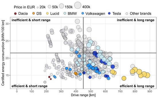 Suitable utility factors could include battery capacity or drive range. Opting for drive range would address range anxiety, which is still a major market barrier for electric cars [37,38]. In fact, our data show that efficient vehicles are available at any price, but drive range has a cost—with the noteworthy exception of a few mid-priced cars that, e.g., consume less than 15 kWh/100 km and offer a drive range of more than 550 km (Figure 6).