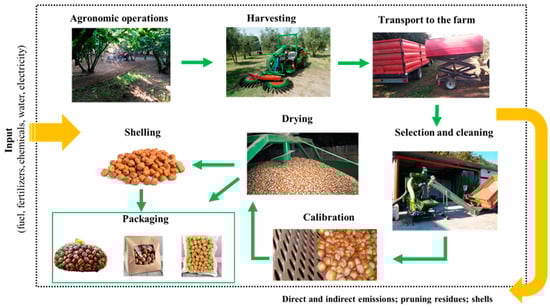 For the development of the assessment, the reference period of the analysis was set to the end of one production cycle, and both the functional unit (FU) and the system boundaries were defined. The FU in LCA studies is the reference according to which all inputs and outputs are processed to allow for comparison between systems or alternatives [32]. The function of the hazelnut systems under study was the production of hazelnuts. Therefore, the basis for the comparison of the different systems, named the FU of the service delivered, was the production of one kilo of unshelled hazelnuts, as also reported in other studies [21,27,28,29]. To better compare the analyzed systems, one hectare of cultivated land was also used as FU. Consequently, to meet the aim of the present research, the system boundaries went from the extraction of raw materials to the farm gate. Specifically, it was a cradle-to-farm gate study that considered, depending on the system analyzed, the agricultural phase, the post-harvest operations, and when present, the subsequent product packaging activities carried out within the farms. Consequently, the analysis considered the different agronomic operations of hazelnut cultivation (soil tillage, mechanized suckering, fertilization, weed control, disease control, irrigation); harvesting and transport to the farm; and when present, cleaning, drying, calibration, storage, and packaging (Figure 2).