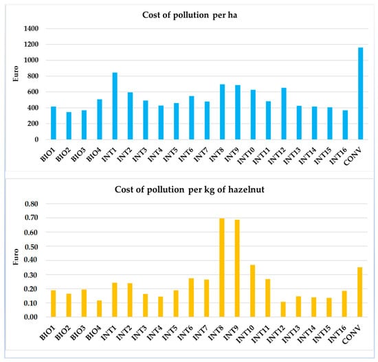Cost of pollution per kg of unshelled hazelnut and per hectare (BIO: organic systems; INT: integrated systems; CONV: system managed according to the ordinary cultivation techniques).