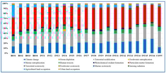 These pollution costs, borne by society, were essentially due to the following impact categories: particulate matter formation, terrestrial acidification, and climate change, which together, depending on the system considered, represented more than 80% of the cost of the impact. At the same time, this was not true for BIO1, in which 25% of the total impact was given by agricultural land occupation (Figure 4).