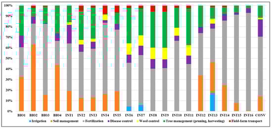 To understand the impact of the different cultivation operations on the cost of pollution, data were aggregated based on the following items: irrigation, soil management, fertilization, disease control, weed control, tree management (pruning and harvesting), and field–farm transport. The operations most responsible for the environmental costs in the different systems analyzed were fertilization, with a percentage weight varying from 20% (in BIO2) to 92% (in INT16), soil management, with a zero percentage weight in INT6–INT11 because no operation was carried out, but which represented 63% in BIO2, tree management, and above all, harvesting, which in some cases, constituted up to 35% of environmental costs (Figure 5).