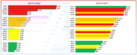 Consequently, according to this distribution, the most sustainable systems per kg of product were BIO4, INT12, INT5, BIO1, and INT4. On the contrary, the least sustainable ones were those belonging to the fifth class (greater than 0.95), namely, INT6, INT11, INT10, INT9, and INT8 (Figure 6). None of this is confirmed at the hectare level; in fact, the distribution of data per hectare shows how systems that had been considered to have little impact per kg of product (such as INT12), essentially because they were very productive, were among those with the most impact per hectare, and, vice versa, systems considered to have an average impact per kg of product, such as BIO2 and BIO3, fell into the second sustainability class at the hectare level because they were not very productive. At this point, we must ask ourselves whether the choice of a product FU is truly descriptive of the system being analyzed or whether, perhaps, it is better to evaluate other more objective FUs. Furthermore, we must ask ourselves whether it is right to talk about sustainability classes referring only to CO2 eq emissions, as happens for other agricultural production [51], or whether it is better to also consider other impact categories and quantify sustainability in a different way.