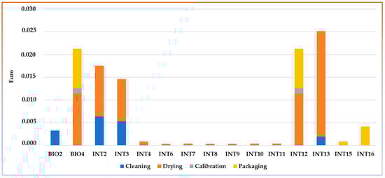 This subparagraph reports the total impacts in economic terms of the systems analyzed based on their system boundary and therefore on the operations they performed in addition to agricultural ones. As can be seen in Figure 9, the environmental cost per kg of product varied from a minimum of EUR 0.14 in the INT15 and INT14 systems to a maximum of EUR 0.70 in the INT8 system. Figure 9 clearly shows the weight of agricultural operations (essentially fertilization, soil management, and harvesting, as fully specified in Section 3.1) compared to post-harvest operations and how systems with sustainable management, while carrying out various post-harvest operations up to vacuum packaging in order to obtain a higher selling price (INT12 and BIO4), remain less impactful than many other systems.