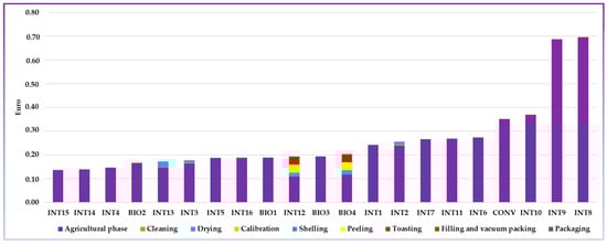 Regarding packaging, only two of the farms analyzed sold unshelled hazelnuts in packs; the farm hosting BIO4 and INT12 systems packaged them in 1 kg paper bags, and the farm hosting INT15 and INT16 systems packaged them in 1 kg plastic nets. As can be seen in Figure 8, which presents a weighing of the environmental impacts in economic terms, packaging in paper bags had a greater impact than nets, which in unit terms were equal to 0.01 kg CO2 eq, 0.003 kg 1,4-DB eq, 0.002 kBq U235 eq, 0.05 m2 yr annual land−1, and 0.005 kg oil eq.