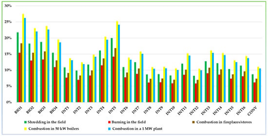 A sensitivity analysis was carried out to evaluate the effects of different management alternatives of hazelnut residues on environmental impact. In reference to pruning residues, the results, as reported in Figure 10, highlight that the environmental impact can vary considerably depending on the disposal method.