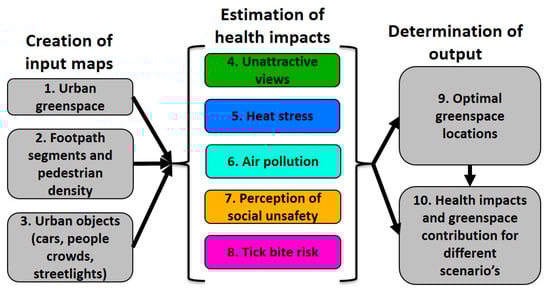 Urban greening is a major goal in policies for sustainable cities [1,2], and the use of urban green space (UGS) to address health and well-being issues related to urban spatial design, such as heat stress and mental stress, is increasingly advocated for [3,4,5,6,7]. Hence, urban policy makers and spatial planners have developed a strong interest in using urban greening for the benefit of resident well-being and urban sustainability [8,9]. Currently, most science-based guidelines and urban policies deal with the various health benefits and burdens of UGS separately [10,11,12]. For example, the impacts of UGS on heat stress in the context of climate adaptation are addressed in isolation from other relevant UGS impacts on urban health [13,14,15]. Moreover, guidelines are often unclear about the quantitative dimension, e.g., how much UGS is needed in a city or neighborhood to achieve a desired level of health benefits. Additionally, urban planners are confronted with contradictory messages because UGS can also have negative consequences for human health through impacts on, for example, pollen concentration and social safety, and the issue- and situation-specific nature of available guidelines and support tools further add to the complexity of UGS planning to promote residents’ health and well-being [16].