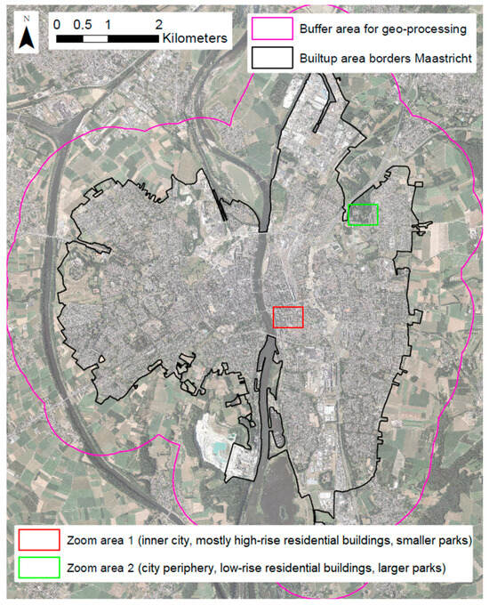 The case study area of Maastricht, including the borders of the built-up area, buffer area, and example (‘zoom’) areas.