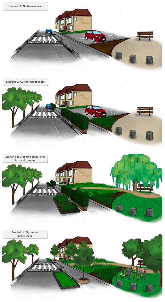 This section introduces the UGS design scenarios for which health impacts were assessed with the model. For all scenarios, privately-owned UGSs were included, but only UGSs in public areas and areas of private owners accessible to the public (pedestrians) were changed in the alternative UGS design scenarios. As such, these scenarios only include design options that are—in principle—within the power of urban spatial planners to implement. For a visual impression of the four UGS design scenarios at street level, see Figure 3.