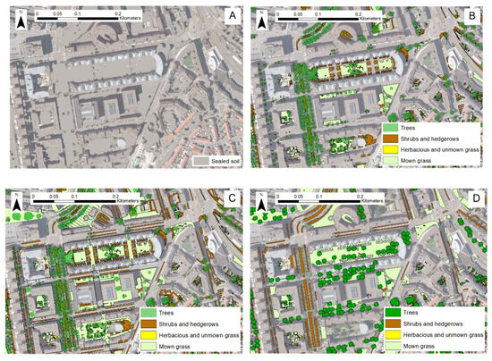 Greenspace design per scenario in example area 1. (A) ‘No greenspace’ scenario. (B) ‘Current greenspace’ scenario. (C) ‘Green parking lots and squares’ scenario. (D) ‘Optimized greenspace locations’ scenario.