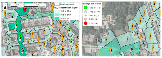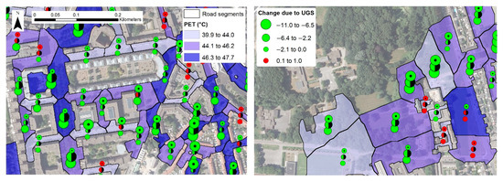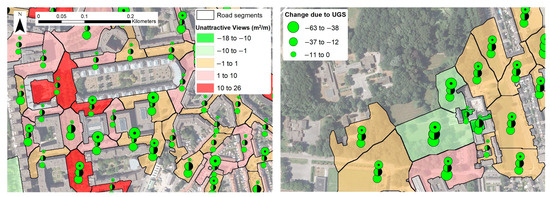 Table 2 presents the results regarding health benefits and burdens and the associated contributions of UGS for the reference scenario (‘No greenspace’) and the three UGS design scenarios (‘Current green space’; ‘Green parking lots and squares’; ‘Optimized greenspace locations’). Figure 6, Figure 7, Figure 8, Figure 9 and Figure 10 show these results at a neighborhood scale (within the example areas) to give an impression of local variation in the values of health determinants and UGS contributions. In these figures and table, the UGS contributions are expressed such that negative values should be interpreted as beneficial for human health because they reduce detrimental health determinant values. Vice versa, positive UGS contribution values should be interpreted as detrimental for human health. Values for health determinants, such as unattractive views, can also be negative, which should be interpreted as beneficial for health as well, as negative scores mean that attractive objects are more dominant for a certain footpath segment.