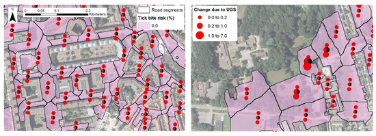 Similar to the ‘Green parking lots and squares’ scenario, perceived unsafety only slightly increased. This can be explained by two factors: (1) relocated hedgerows only slightly blocked the view and sightline of pedestrians, and (2) only trees with high crowns were moved closer to pedestrian areas. Another reason why perceived unsafety only showed a slight increase is that the optimization method replaced trees closer to the footpath with low tree crowns as well as tall shrubs with trees with high tree crowns. In contrast with the UGS design scenario, ‘Green parking lots and squares’, the optimization method did not add shrubs in areas with overarching trees, very nearby footpaths, or in tick host habitats. As a result, tick-bite risk did not increase. For street segments with a tick-bite risk larger than zero in the ‘Current greenspace’ scenario and with only publicly accessible UGS affecting footpaths, the risk was reduced to zero in the ‘Optimized greenspace locations’ scenario. This was due to the fact that all shrubs and herbs were removed from these places and replaced by mown grass where possible.