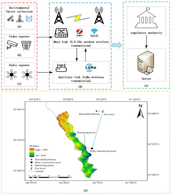 Overall network monitoring routes and network data transmission maps. (a) Environmental factor acquisition sensors; (b) video capture camera; (c) audio capture pickup arrays; (d) wireless network data transmission, primary link: 5.8 GHz wireless network transmission, secondary link: LoRa wireless network transmission; (e) the local authority, where the data are transmitted back to the authority’s servers for storage via the wireless network; (f) the location of the passive acoustic monitoring system in the Ailao Mountains, Chuxiong City, Yunnan Province.