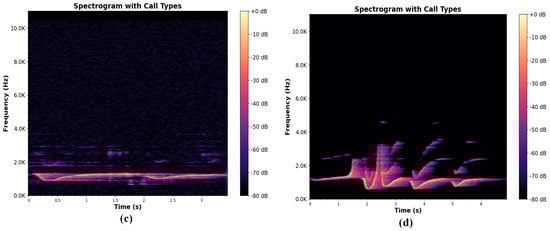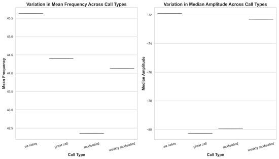 Figure 3 shows the differences in different call types in terms of frequency and amplitude. From the figure, it can be concluded that the “aa notes” call type has the highest average frequency, which is around 45.5 Hz, the “great call” call type has lower average frequency, which is around 44.5 Hz, the ”modulated” call type has the lowest average frequency, which is close to 42.5 Hz, and the “weakly modulated" call type has the lowest average frequency, which is close to 42.5 Hz. The “modulated" call type has the lowest average frequency, close to 42.5 Hz, and the “weakly modulated” call type has an average frequency close to 44 Hz. The study found that the “aa notes” call type had the highest average frequency of about 45.5 Hz, while the “modulated” call type had the lowest average frequency of about 42.5 Hz, which may be related to specific behavioral patterns or environmental adaptations. The “aa notes” call type had the highest amplitude of nearly −72 dB, suggesting that this type of call is louder and may be advantageous in specific social interactions. In contrast, the “modulated” call type had the lowest amplitude at about −78 dB, indicating a more subdued acoustic signature.
