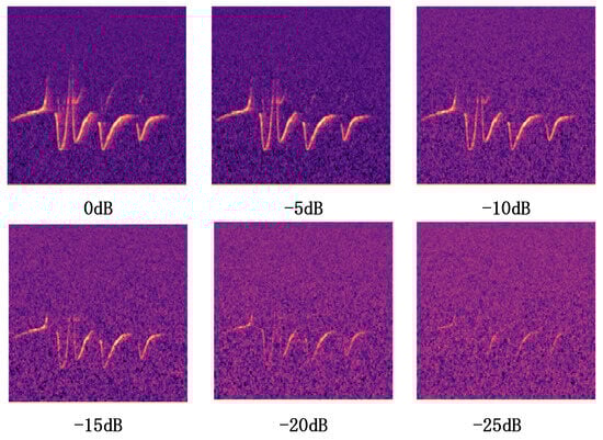 Examples of spectrograms according to different noise levels of 0 dB, −5 dB, −10 dB and −15 dB.