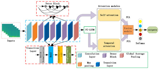 Hence, to efficiently identify extended sequences of vocalizations produced by western black-crested gibbons, we propose the utilization of a hybrid neural network known as DenseNet+Self-Attention-LSTM-Attention (SA_DenseNet-LSTM-Attention). The reason we chose the DenseNet network [56] for our backbone network is because the dense convolutional network (DenseNet) is an architecture that can effectively address problems such as gradient vanishing and gradient explosion as the number of network layers continues to increase. With limited Mel spectrum data, the DenseNet network performs better than CNN at obtaining training data. We attach a fully connected LSTM (FC-LSTM) to the completely connected layer of DenseNet in order to effectively represent and learn the time-frequency properties of the input audio. More importantly, the mutual combination with the LSTM network aids in the extraction of spatio-temporal features by the overall network [57]. The temporal attention module was then used to find key time-frequency feature information in the successive calls of the gibbon calls. This is shown in Figure 5. In addition, we feature-fused the channel, spatial, and time-frequency features extracted from the entire network, which effectively extracted gibbon call features with different call durations and also reduced the dimensionality and weight of the final output of the attention module. In conclusion, a substantial quantity of ablation experiments and comparative tests were undertaken to assess the performance of our proposed model in comparison to a number of the more sophisticated classical network models.