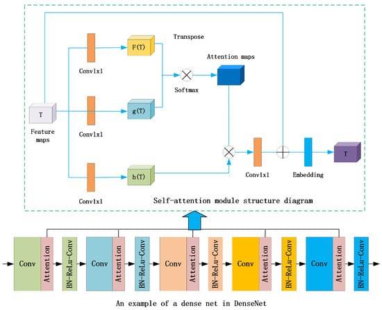 The upper part, as shown in Figure 6, is the self-attention module, where first, the channel dimension of the input feature map is compressed by 1 × 1 convolution to reduce redundant information and improve computational speed. Then, the transpose operation is performed on the output feature maps of the F(X) branch and matrix multiplication is performed with the output feature maps of the g(X) branch to obtain the similarity between feature maps. Next, the similarity is normalized using Softmax function to obtain the attention matrix. Finally, the feature maps of the h(X) branch are multiplied with the feature maps of the other branch to obtain the final feature maps, which realizes the weight reassignment of the features. Subsequently, the outcome is supplied to the Softmax function, and a 1 × 1 convolution kernel is employed in the output processing to maintain channel consistency with the input feature map’s channels.