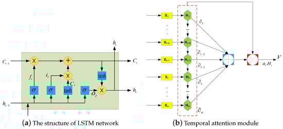 Since the temporal attention mechanism can effectively extract temporal features with different description lengths, this paper also incorporates the temporal attention mechanism in the LSTM network of the gibbon recognition network. The specific structure is shown in Figure 7b. In Figure 7b, the control unit modules comprise the gate loop of the LSTM network. The contents of represent the outputs of the gate-loop control unit modules in the LSTM network. These contents are subsequently inputted into our model of the temporal attention mechanism, with the particular output of the hidden layer illustrated as follows:
