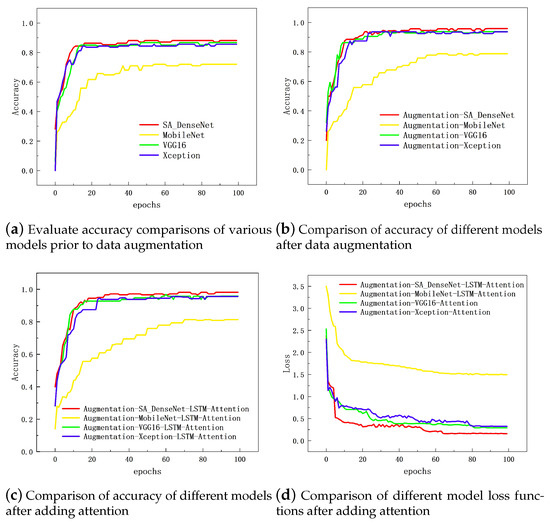 A comparison of the accuracy and loss of our model in relation to alternative models. (a) represents the model accuracy comparison in the absence of data augmentation; (b) represents the model accuracy comparison in the accuracy of models following data augmentation; (c) represents the accuracy comparison between the addition of the LSTM module and data augmentation using an attention mechanism; (d) represents a comparison between the loss before and after data augmentation and the addition of the LSTM module using an attention mechanism.