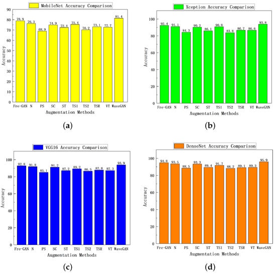 We then concurrently compared the accuracy, precision, recall, and F1-score of four distinct models following WaveGAN data augmentation to show the efficacy of our suggested data augmentation. After the experiments, it is proved that the accuracies of the four models are improved after further data augmentation, in which the DenseNet model is improved by 7.8%, the VGG16 model is improved by 7.1%, the Xception model is improved by 8.2%, and the MobileNet model is improved by 7.0%, which is shown in Table 6 and Figure 8b, and finally, the model chosen in this paper, the DenseNet model, is better and more stable than other models.