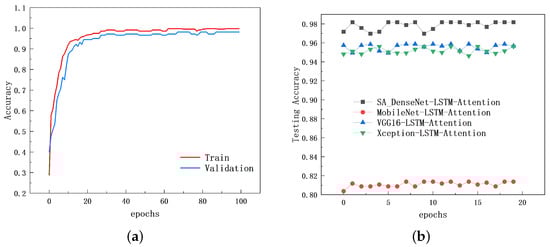 Model evaluation. First, we show how the accuracy of our proposed network compares on the training and validation sets; second, we put all the trained models to real-world tests and compare the test accuracies of each comparison model. (a) Comparison of the accuracy of the DenseNet+Self-Attention-LSTM-Attention-based model in the training set and validation set after data augmentation. (b) Comparing the accuracy of different model validation sets.