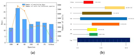 To test the effectiveness of our training model (SA_DenseNet-LSTM-Attention), we selected one month (April) of acoustic monitoring data from 2021 segmented by zhou et al. [34] for testing, and we counted western black-collared gibbons and several bird species with a high number of chirps, as shown in Figure 11a. In Figure 11a we counted the number of days monitored and the number of calls made by the Western Black-crowned Gibbon and 6 different bird species in April. During our testing, we found that the model could effectively recognize most of the calls, with most of the errors concentrated in cases where multiple calls were mixed, in which case there is no guarantee that our model can effectively recognize all call types. In Figure 10 it can be seen that most of the calls of these species are concentrated before 12 o’clock. Some birds (Pomatorhinus ruficollis) had a wider range of calling time periods, concentrated in the morning through the afternoon.