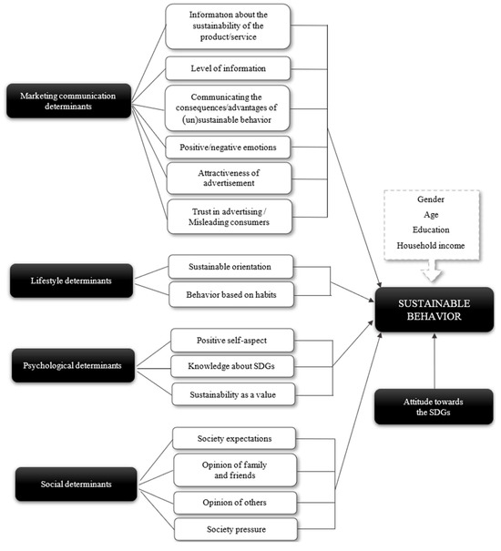 This study has several substantial implications for marketers and the promotion of sustainability and SDGs. The conclusions drawn from the empirical analysis of the determinants of consumers’ sustainable behaviours provide valuable insights that can guide future marketing strategies. First, this study highlights the importance of personal values. To foster such values, marketing communication should address the emotional side of the consumer decision-making process. According to Maheshwari [2], the emotional domain is the key to raising awareness among people. Hence, it is reasonable to assume that advertising green products with emotional content that is in line with consumers’ personal values will be more successful than standard advertising. However, additional research is needed to better understand what contributes to the formation of stronger environmental values. Second, consumers are not aware of SDGs. More than three-quarters of the respondents had never heard of them or had insufficient knowledge of them. Some authors [109] have argued that governments should increase the provision of environmental education to the public and enhance people’s levels of environmental knowledge to (indirectly) encourage pro-environmental behaviours. Even though greater awareness and knowledge do not necessarily promote sustainable behaviour, they modify attitudes, which are positively correlated with behaviours [61]. Third, the social dimension—that is, the opinions of reference groups and societal expectations—emerged as an important determinant in this study. This implies that apart from highlighting environmental benefits, marketing strategies should emphasise that behaving sustainably can enhance one’s image. Highlighting a consumer’s social responsibility and their role in solving sustainability challenges could increase their pro-environmental behaviours. Fourth, marketers should be aware of the importance of trust. Individuals depend on the information provided by marketing communications, which requires consumers’ trust, especially in the case of high levels of uncertainty and low levels of knowledge, as is typical of the domain of environmental risks. The frequency of these communications should also be monitored because they may prove counterproductive. The growing number of sustainability claims in adverts may increase consumer scepticism.