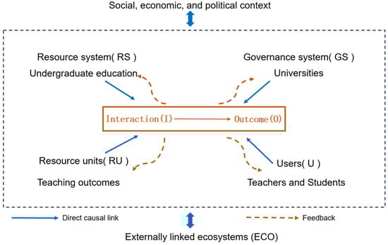 According to the current situation of higher education in China, which draws together Ostrom’s social-ecological system framework, the basic structure for the IPEIEE social-ecological system is deconstructed as four core subsystems of “Resource system”, “Resource units”, “Users”, and “Governance system”, as shown in Figure 1. The research framework demonstrates the core subsystems, system contexts, linked systems, and interactive relationship among these three types of variables in the social-ecological system of the IPEIEE by simple and integrated forms [69]. The system contexts include society, economy, and policy context, which provide a favorable environment for IPEIEE activities, while teachers and students participate in the process as system users.
