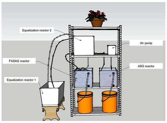 The experimental device is a fixed activated sludge with attached growth process (FASAG) and aerobic activated sludge-suspended growth process (ASG) to evaluate the efficiency of integrating aerobic and anoxic processes in the same reactor (Figure 1). FASAG and ASG reactors are made of plastic with the same dimensions (length × width × height) of 38 cm × 30 cm × 35 cm. The working volumes of each reactor are 31 L (FASAG) and 30 L (ASG). The volume displaced by the biofilm carrier materials results in a greater working volume in the FASAG reactor. The two equalization reactors, 1 and 2, are also made of plastic with volumes of 70 L and 20 L, respectively. Soft plastic piping systems for allocating water and air distribution materials are installed to distribute oxygen in each reactor.