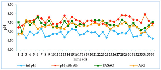 The feasibility of combining the FASAG and ASG processes in a reactor is demonstrated by the experimental findings. The Figure 3 shows that the pH of the influent wastewater ranged from 6.62 to 7.17, and it increased to 7.25 to 7.91 after chemicals were added to provide alkalinity. The measured pH values were suitable for biological treatment [14]. After going through the biological treatment process, the pH in FASAG was generally 6.98–7.67, slightly higher than in ASG, which was 6.87–7.56. Anoxic conditions created by activated sludge adhered to the substance of biofilm carrier materials prevent the anoxic zone (inner layer) from receiving enough oxygen, leading to denitrification, which returns alkalinity and raises pH [15].