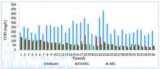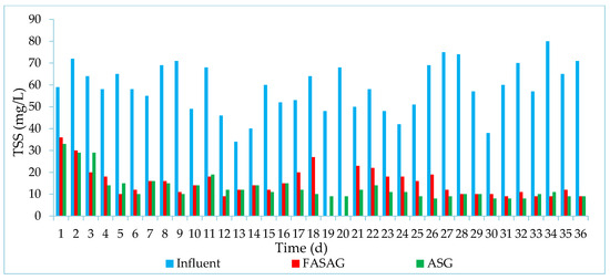 The influent wastewater contained between 34 and 80 mg/L of total suspended solids. In the stable stage, the TSS value in the treated wastewater of the ASG reactor was between 8 and 11 mg/L, and in the treated wastewater of the FASAG reactor, it varied from 9 to 12 mg/L. In general, the TSS concentration after treatment of both processes was similar. The range of treatment effectiveness was 77% to 88% (Figure 7).