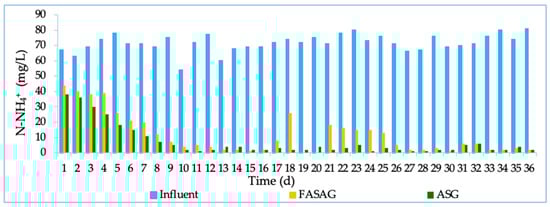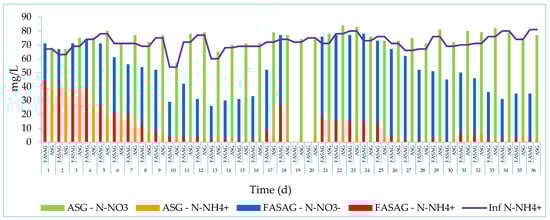 The ammonia concentration in the influent wastewater (54–84 mg/L) was always more than the total ammonia and nitrate concentration after treatment of the FASAG reactor (31–50 mg/L) in the adaption stage, as shown in Figure 10. A 10-day treatment period was affected by the presence of red worms as described. After that, the total concentration of ammonia and nitrate in the effluent water was always smaller than the influent ammonia concentration, proving that the denitrification process occurs simultaneously in the [22,23]. The fixed activated sludge with an attached growth system reaches the highest efficiency on day 34 with a treatment efficiency of 53%. A common explanation for this phenomenon is that denitrification occurs in the inner layer, supported by the existing DO gradients, while autotrophic nitrification occurs simultaneously on the surface of the microbial film that adheres to the carrier material [24,25]. In contrast, in the ASG reactor, the total ammonia and nitrate concentration after treatment (57–91 mg/L) and the input ammonia concentration (54–84 mg/L) are approximately equal or higher due to the amount of organic nitrogen (N- org) that was converted into ammonia and then further nitrified. It is also evident that denitrification does not occur in the aerobic-activated sludge-suspended growth process.