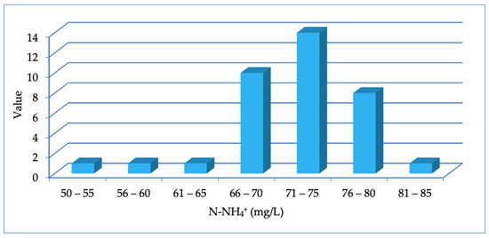 The graphs in Figure 8 and Figure 9 indicate that the ammonia of wastewater had a concentration between 54 and 81 mg/L. However, the most frequent value was between 66 and 80 mg/L. The ammonia conversion efficiency of the ASG reactor grew steadily throughout the first eight days of operation, from 43% to 85%, with the ammonia content after treatment decreasing gradually from 38 mg/L to 11 mg/L. Because no red worms developed in the experimental reactor, the ammonia concentration of the effluent wastewater remained constant between 1 and 7 mg/L from the 9th day until the completion of this study. The stable conversion efficiency of ammonia reaches 90% to 99%. Moreover, on the first day of operation, the ammonia content of the FASAG reactor dropped from 67 mg/L to 44 mg/L. The treatment effectiveness grew over the next few days, stabilizing on the ninth day with an ammonia content of 7 mg/L. After treatment, the nitrification process proceeded steadily, with ammonia content varying between 1 and 8 mg/L until the 17th day. The concentration and quality of sludge in the model were impacted by the appearance of red worms on the eighteenth day, which consumed nitrifying bacteria. As a result, the ammonia concentration rose to 26 mg/L following treatment. After ceasing to run for two days without supplying oxygen to kill red worms, the reactor kept running in the same condition. Ammonia levels started at 18 mg/L on the 21st day of operation and progressively reduced to 5 mg/L on the 26th day and were stable in the range of 1–6 mg/L until the end of the model. Treatment efficiency reached a high 91% to 99%, relatively higher than some research that treated ammonia with the aerobic integrated fixed-film activated sludge process (IFAS) [19,20,21]. In general, the nitrification efficiency of the two reactors is equivalent (the highest treatment efficiency is 99%, corresponding to an ammonia concentration after treatment of 1 mg/L). In comparison, ASG takes 8 days to adapt and is most effective on the 11th day, but FASAG takes 9 days and is most effective on the 15th day.