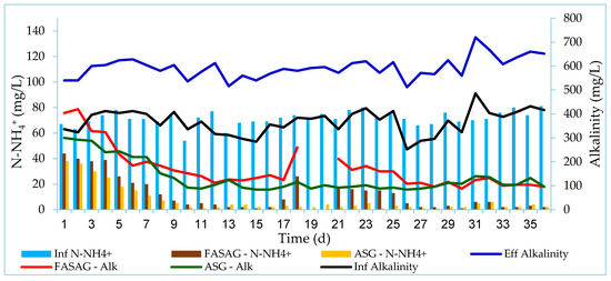 Analysis results from Figure 11 show that the available alkalinity in the influent wastewater ranges from 284 to 486 mg/L. The alkalinity after adding NaHCO3 is 7.14 mgCaCO3/mgN-NH4+, enough to convert the amount of ammonia in the influent wastewater [26]. The ammonia conversion efficiency with both experimental reactors is 91–99% (1–7 mg/L), and following FASAG treatment, the remaining alkalinity (88–212 mg/L) is comparatively higher than that of ASG (88–136 mg/L) due to alkalinity formed during the denitrification process at FASAG [24]. The significant use of alkalinity from denitrification for nitrification makes the integration of aerobic and anoxic process research a promising solution. It helps reduce chemical use and is more environmentally friendly.