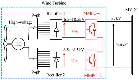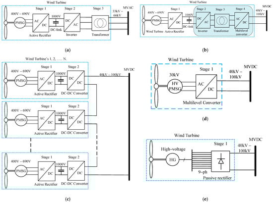 A list of wind power conversion configurations to connect a wind turbine with an MVDC bus. (a) Existing wind turbine conversion systems connecting to an AC collector grid [13,14]; (b) converting existing wind turbines for connection to an MVDC collector grid by adding an AC-DC stage at the output of the turbine transformer [18,19]; (c) the series connection of wind turbines with a DC-DC converter for connecting to an MVDC collector gird [20,21,22,23]; (d) a wind turbine conversion system with a high-voltage PMSG, and a multilevel AC-DC converter connecting to an MVDC collector grid [24,25,26,27]; (e) a wind turbine conversion system with a multiphase high-voltage HG and a multiphase passive rectifier connecting to an MVDC collector grid [28,29].