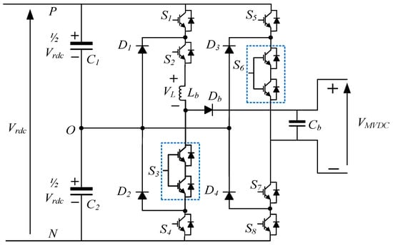 - Mode II: Figure 4b—S1, S2, and S7 turn ON while the rest of the switches turn OFF. The energy will be delivered to the load, i.e., MVDC grid, through the capacitor (C1), and diode (Db). In this mode, the inductor voltage and current are expressed as