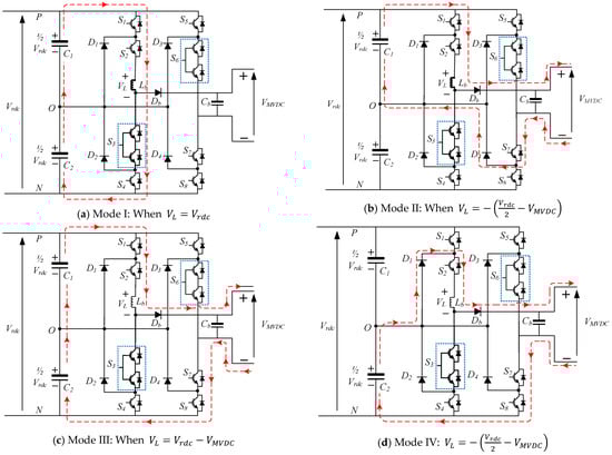 Figure 3 shows the circuit topology for the proposed DC-DC MMPC converter, which includes (i) two legs connected in parallel in a half-bridge topology and (ii) each leg contains five switches, being S1, S2, S3(a,b), and S4 for the first leg and S5, S6(a,b), S7, and S8 for the second leg; (iii) a middle point of each leg that is connected to two series diodes and clamped to the middle point of two DC-link capacitors; (iv) an inductor (Lb) that is in series with a leg, an output diode (Db), and a capacitor (Cb) at the output terminals. The inductor acts as a temporary energy storage providing the MMPC converter with boosting capabilities. Placing Lb only on leg one gives boost capability, and it also seems and behaves like a conventional boost converter, which can be easily analyzed from operational modes for charging and discharging of the inductor depicted in Figure 4. It is worthwhile to note that it is possible to include two inductors, one per leg, but it is not required here as it complicates the analyses as well as overall cost and size of the proposed converter.