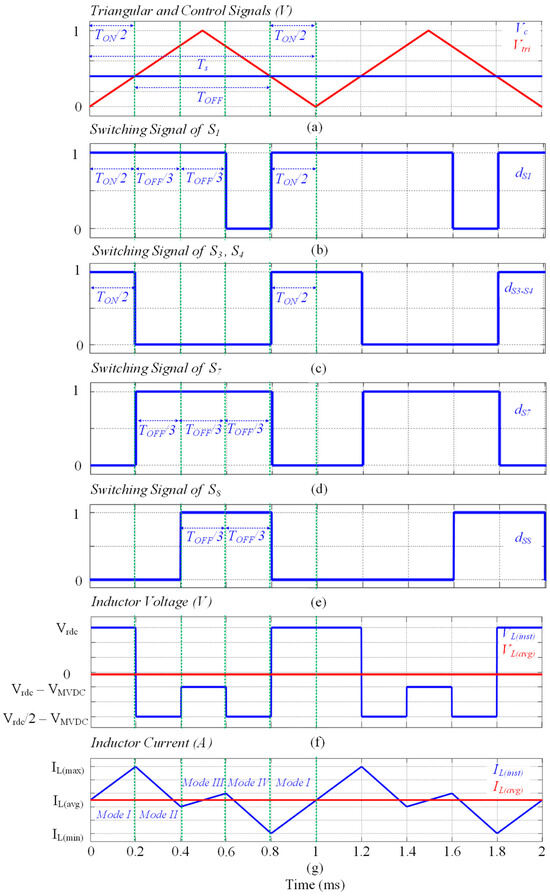 Figure 5a shows the generation of switching signals for the MMPC converter, where the triangular waveform, denoted as (Vtri), represents the carrier signal in pulse width modulation (PWM), while the control signal (Vc) represents the desired MVDC output voltage of the MMPC converter. Note that to ensure generic applicability, the signals are normalized. The time period of Vtri is denoted by Ts, which is further divided into turn ON (TON) and turn OFF (TOFF) times. TON is the time when Vc is greater than Vtri: during this interval, all the switches in leg 1, i.e., S1, S2, S3, and S4, are ON while leg two switches S5, S6, S7, and S8 are OFF. This period defined earlier is characterized as Mode I, wherein the inductor is fully charged as the source terminals are shorted via the inductor. Consequently, the duty cycle of switches S1, S2, S3, and S4 in this mode is represented by d1: