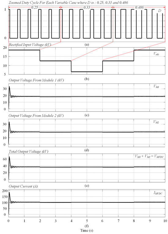 Simulation results of the proposed MMPC boost converter: (a) duty cycle for each case, (b) variable rectified input voltage , (c) output voltage across module 1 , (d) output voltage across module 2 , (e) output voltage , and (f) output current .