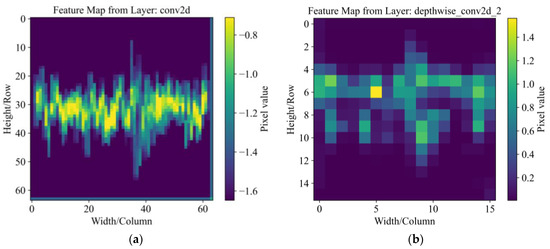 Figure 13a,b present the feature maps corresponding to the first channel of the initial convolutional layer in Ul-Inception28, with Figure 12a,c serving as input images, respectively. Various locations on the feature map correspond to distinct pixel values, which are represented by different colors. Remarkably, the feature map of the aforementioned channel bears a significant resemblance to the time-domain image. Conventionally, the initial convolutional layer is responsible for learning and extracting fundamental features from the image, including edges, colors, and textures. These characteristics play a pivotal role in the subsequent identification and comprehension of the image. The convolutional kernel parameters, obtained through rigorous training, signify optimized outcomes for the entire training dataset. Consequently, when handling diverse input images, these convolutional kernels efficiently extract pertinent features, showcasing their efficacy. This suggests that the extracted feature maps exhibit variations based on different inputs, highlighting the distinctive nature of the input data.