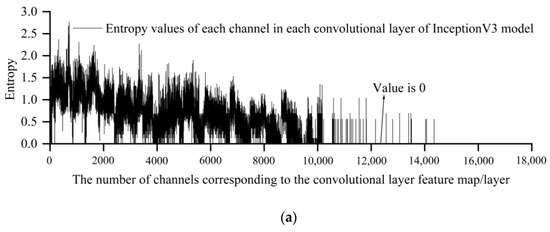 When the feature maps of every channel in a particular convolutional layer of a CNN all have a size of 1 × 1, it only denotes that the entropy of each individual channel’s feature map in that layer is 0. However, this does not necessarily mean that the entropy of the entire convolutional layer’s feature maps is 0. As long as the pixel values of the feature maps in different channels of that layer vary, the entropy of the convolutional layer may not be zero. Additionally, even if a channel’s feature map size is not 1 × 1, but all pixel values on it are the same, the entropy of that channel’s feature map will still be zero. An entropy value of zero for feature maps in one convolutional layer of a CNN model does not imply that subsequent layers will also have zero-entropy feature maps. Due to complex interactions between layers, weight updates, the influence of activation functions, and network design choices, such as skip connections and batch normalization, subsequent layers can potentially regain non-zero-entropy values for their feature maps.