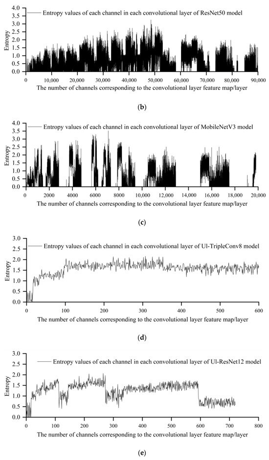The entropy of feature maps from each channel of every convolutional layer in various convolutional neural network models is calculated. The entropy calculation method for feature maps is shown in Formula (8). A higher entropy of the feature map signifies a more uniform distribution of pixel values without any dominant ones, denoting that the model considers multiple possibilities when extracting features and possesses greater uncertainty. High entropy can be beneficial because it denotes that the model is more robust to variations in the input data. Conversely, lower entropy denotes a more concentrated distribution of pixel values in the feature map. This might denote that the model has strong confidence in certain features and can clearly identify them. However, excessively low entropy could lead to overconfidence, potentially causing the model to disregard other possibilities and perform poorly when presented with new, unseen data.