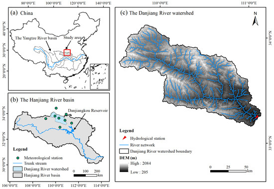 The location of the study area and the hydro-meteorological stations. (a) The geographical location of the Danjiang River watershed (study area) in the Yangtze River basin, China. (b) The location of the selected eight meteorological stations and the location of the study area relative to the Danjiangkou Reservoir in the Hanjiang River basin. (c) The digital elevation model (DEM), river network, and hydrological station of the study area.