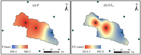 The spatial distribution of annual (a) precipitation and (b) potential evapotranspiration (ET0) in the Dan-jiang River watershed during the period of 1960–2017.